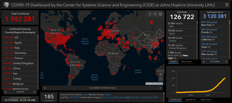 По данным университета Джонса Хопкинса, в настоящее время число случаев заражения коронавирусом в 185 странах приближается к двум миллионам и составляет 1 982 281.