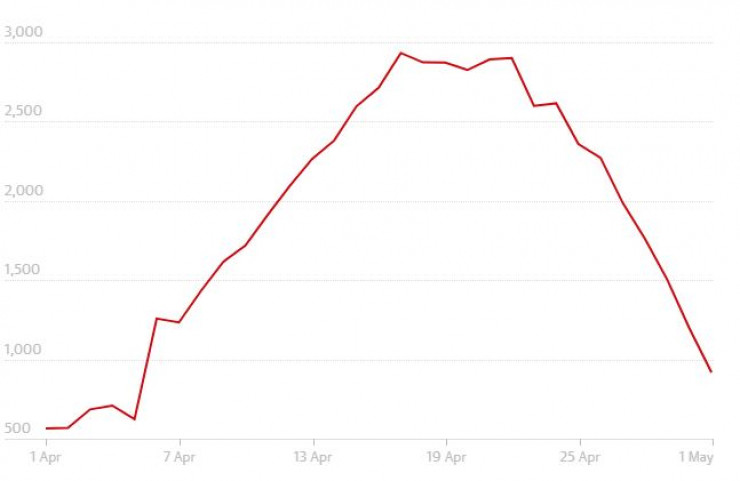 График прогнозируемых суточных показателей смертности от COVID-19 с 1 апреля по 1 мая в Великобритании. Источник: IHME.