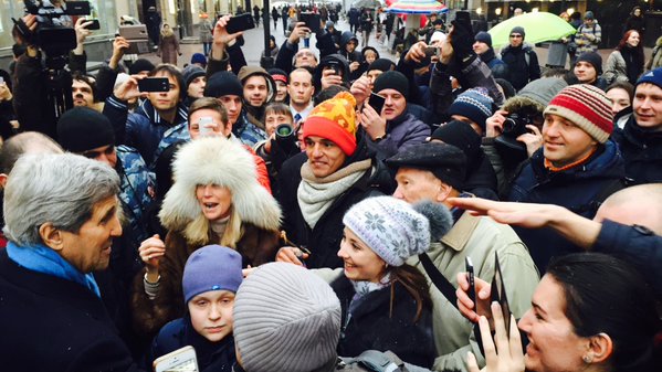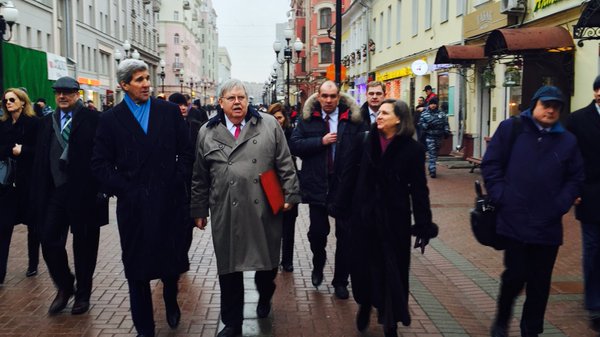 Госсекретарь США Джон Керри во время визита в Москву 15 декабря совершил прогулку по Старому Арбату. Высокого гостя сопровождали его помощница Виктория Нуланд и посол США в России Джон Тефт. Фотографии с этого события опубликовал в Twitter пресс-секретарь американского посольства Уильям Стивенс.