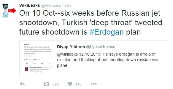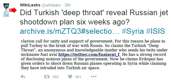 При этом WikiLeaks ссылается на влиятельного инсайдера во властных структурах Турции - Фуата Авни, которого в Турции называют местным Джулианом Ассанжем. "10 октября - за 6 недель до того, как был сбит российский самолет, - турецкий источник сообщал в Twitter о будущих планах Эрдогана сбить самолет", - говорится в сообщении Wikileaks.