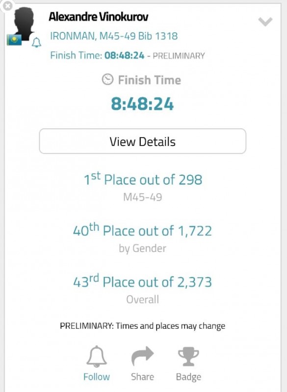 Беговой этап, представляющий марафон, Винокуров завершил за 3:12:17. Всего же на всю гонку он затратил 8:48:24. В своей возрастной категории он показал первый результат. При этом среди всех участников Винокуров стал 43-м. Отметим, что в прошлом году он показал 9 часов, 13 минут и 38 секунд, став шестым.
