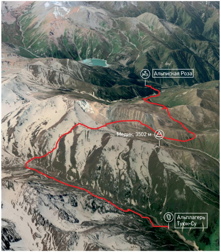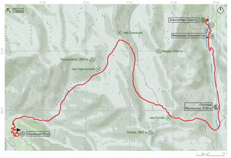 Описание: "Альпийская роза" - перевал Терешковой - перевал Трапеция - перевал Титова - Мынжилки - Туюксу - Медеу