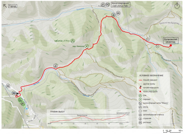 От Медеу идем по маршруту 104 в восточном направлении. Тропа выходит в Бутаковское ущелье выше спорткомплекса. По ущелью ведет проселочная дорога, по которой продолжается путь на юг. Медленный подъем через 30 минут приводит к берегу речки, текущей параллельно дороге, которая переходит в тропу. Тропа поднимается вверх по долине, пересекает ручей и выходит на широкое луговое поле. Правый берег Бутаковки хорошо просматривается на протяжении полукилометра с тропы, идущей по левому берегу. К концу поляны ущелье сильно сужается. В узком месте находится турбаза "Экстрим" - филиал горнолыжного комплекса "Табаган". Тропа раздваивается: одна идет вверх по ущелью, а наш путь лежит по тропе, которая ответвляется в боковое ущелье налево.
